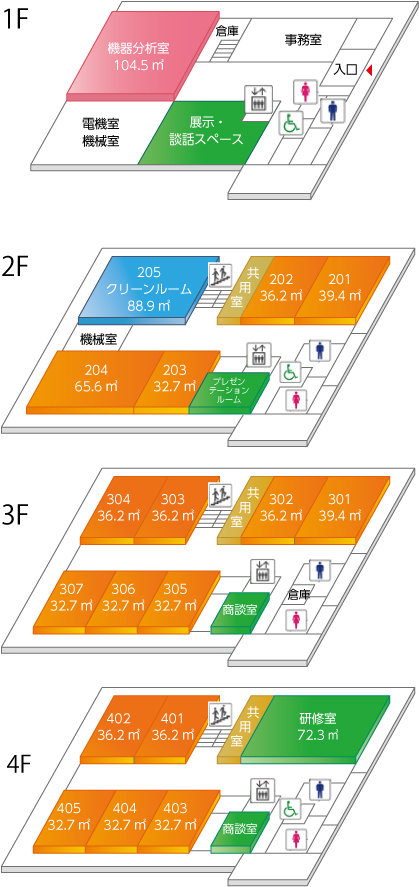 当センターには、レンタルラボが16室、クリーンルームが1室、機器分析室があります。